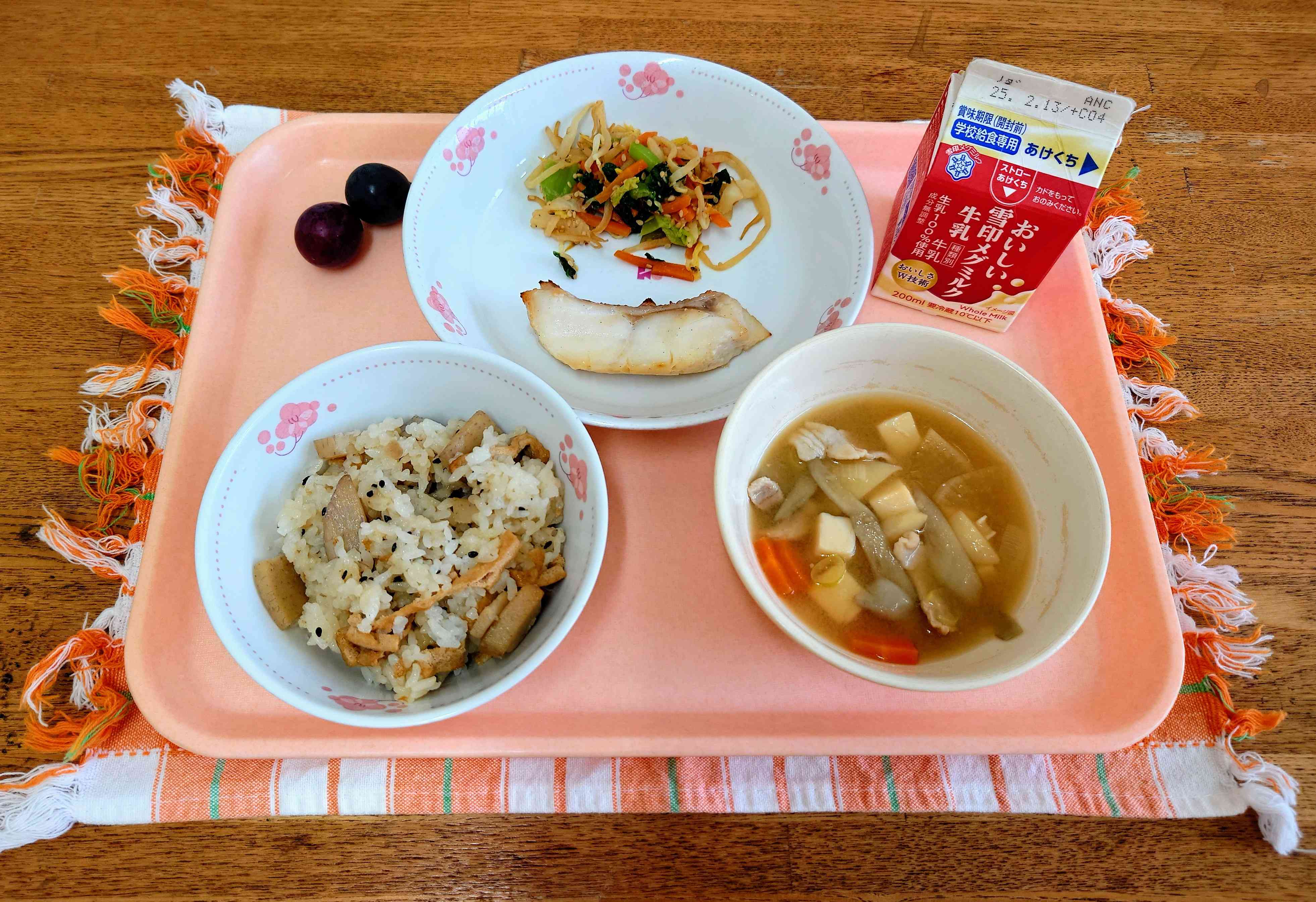 【今日の献立】 ・里いもごはん ・あかうおの塩麹焼き ・ごまあえ ・豚汁 ・巨峰 ・牛乳 10月6日は十五夜でした。 十五夜は芋の名月とも呼ばれており、お月見をするときには、団子や里いもをお供えします。そのため、ごはんは里いもごはんにしました。里いもにしっかりと味をしみ込ませ、おいしく食べられるようにしました。 果物には巨峰を出しました。 こどもたちには、給食放送で巨峰の皮を簡単にむくための方法をクイズにして紹介しました。ぜひ、ご家庭で巨峰を食べる機会がありましたら、簡単な皮のむき方を聞いてみてください。【添付ファイル】
