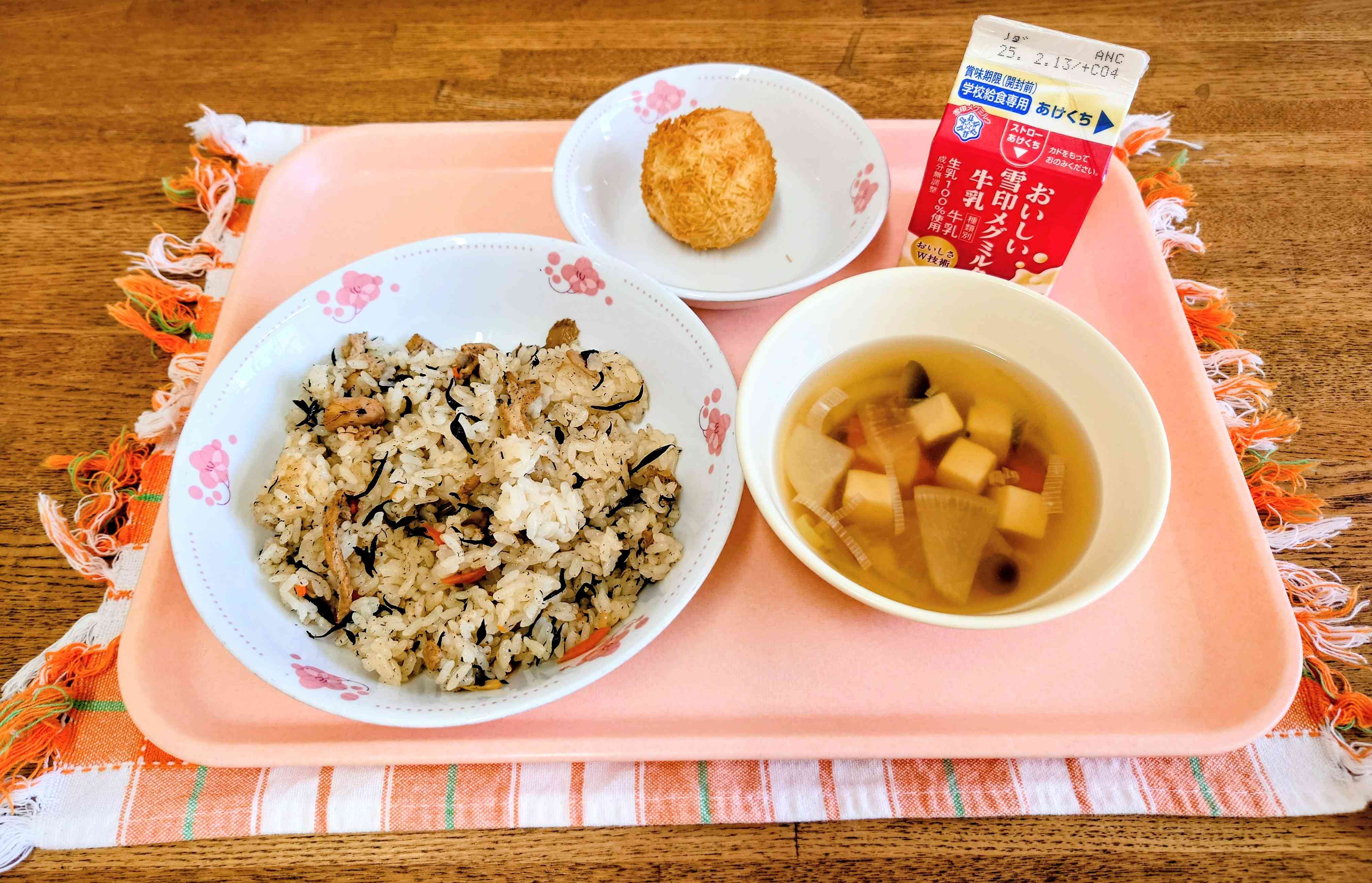 【今日の献立】 ・ひじきと舞茸のごはん ・秋野菜のすまし汁 ・いが栗くん ・牛乳 いが栗くんは、いがぐりをイメージした料理です。 さつまいもに細かく刻んだ栗を練り込み、丸め、砕いたそうめんを衣につけて、油で揚げます。 さつまいもの甘みと、そうめんの塩気、両方を味わえます。 秋を感じさせる、今の時期おすすめの一品です!
