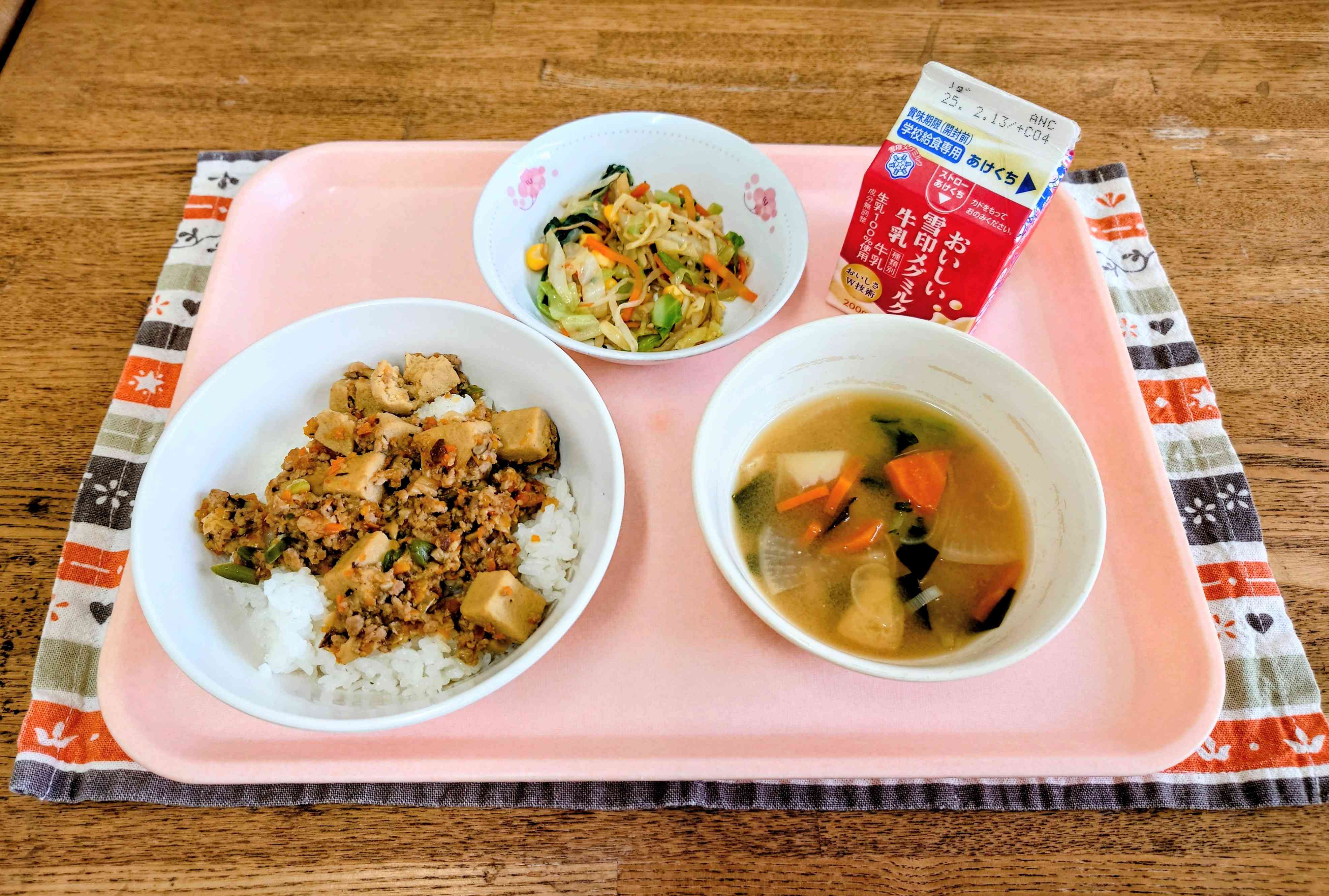 【今日の献立】 ・高野豆腐入りそぼろ丼 ・野菜のピリ辛和え ・具だくさんみそ汁 ・牛乳 高野豆腐入りそぼろ丼は、高野豆腐の甘みが加わった、甘辛のどんぶりです。 こどもたちもどんどんご飯が進み、残菜も少なかったです。 高野豆腐は鉄・カルシウムが多い食材で、どちらも成長期のこどもたちに欠かせない栄養素です。 ぜひご家庭でも積極的に取り入れてみてください!