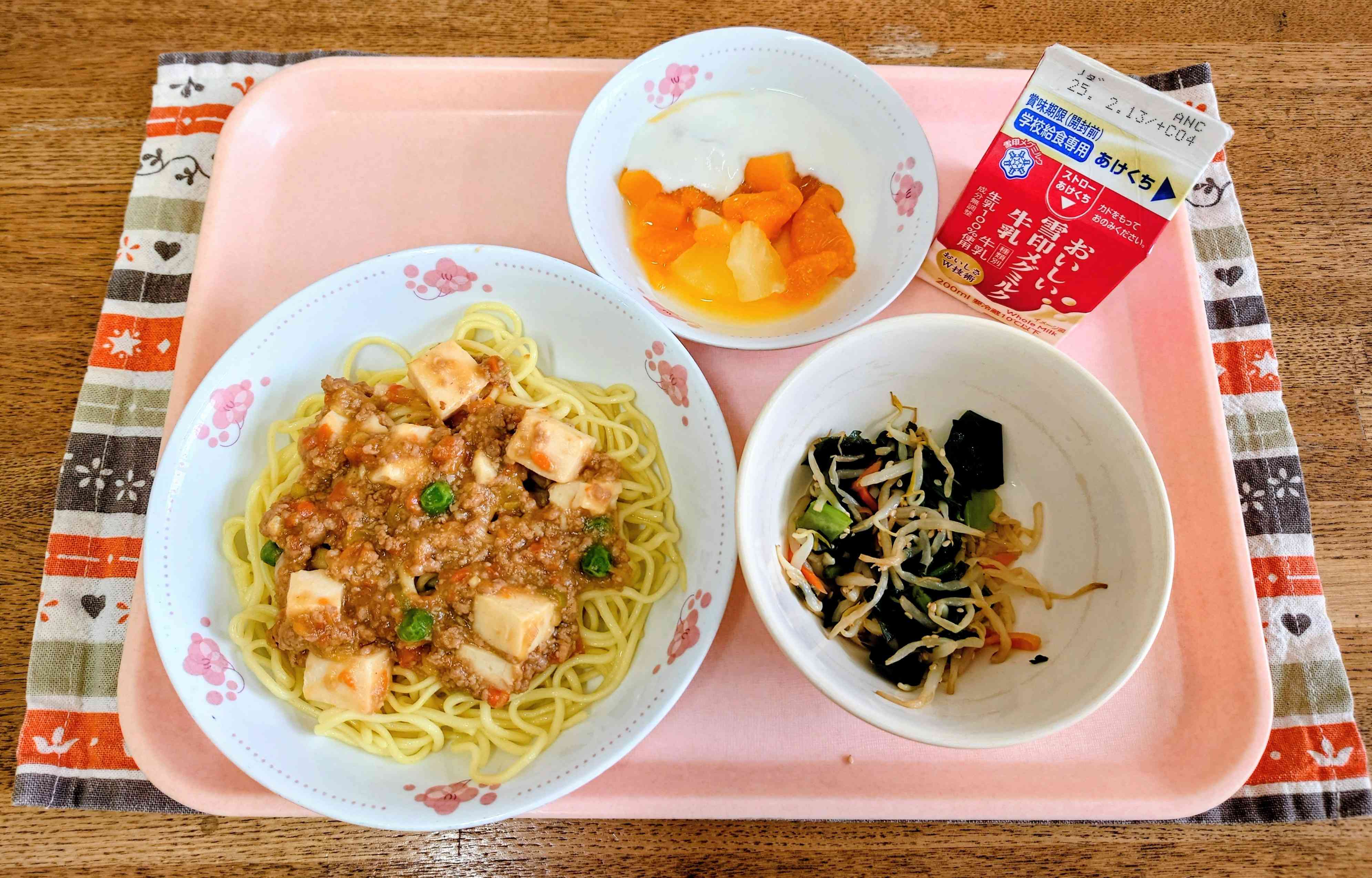 【今日の献立】 ・麻婆麺 ・もやしとわかめのごまじょうゆ ・フルーツのヨーグルト添え ・牛乳 今日の給食放送では、「地域と味」について話をしました。 麻婆麺の上にのせている麻婆豆腐は、中国四川省の料理です。 四川省の料理の特徴の一つは、辛みが強いことです。 なぜ四川省の料理は辛いのかというと、四川省は寒い地域だからです。唐辛子には、体を温める効果があるため、寒い地域である四川省では、辛い料理が生まれたということをクイズを交えて話しました。 地域の気候によって、料理の特徴が変わる。調べてみると、面白いですよと伝えました。 また、今日は午後に地域清掃もありました。 麻婆麺を食べ、体をほかほかにし、エネルギーをしっかりチャージして、午後の掃除を頑張りましょうと呼びかけました。 「いっぱい食べたから、掃除頑張れそう!」「野菜も食べたら風邪にも強くなりそうだね」と、こどもたちはしっかり食べてくれました。【添付ファイル】